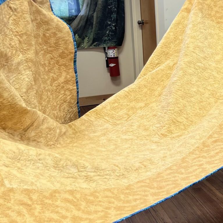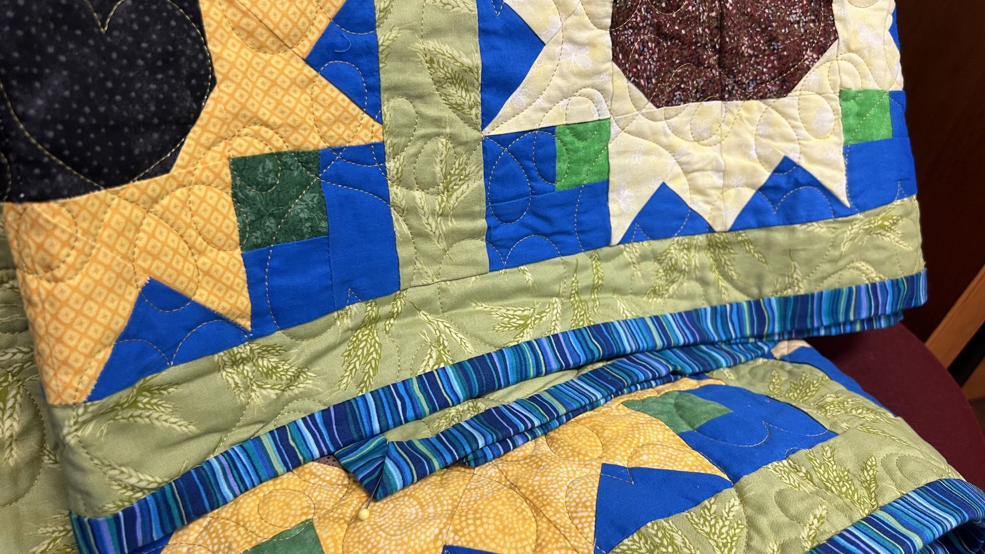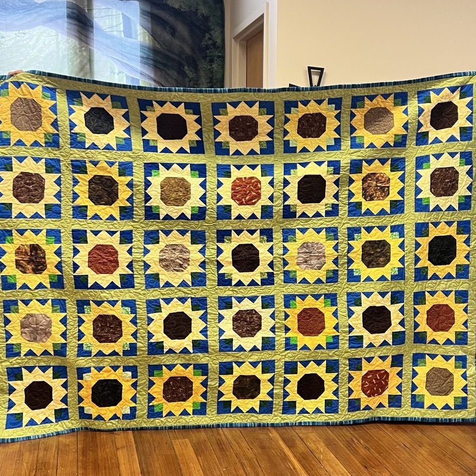 In the spirit of the quote, some of the women of All Hands In (AHI) have been working on a project to raise money for Ukrainian refugees. The AHI Sewing Studio women have crafted a quilt in the blue and gold of the Ukrainian flag, with the theme of sunflowers, the national flower, and wheat, a primary export.